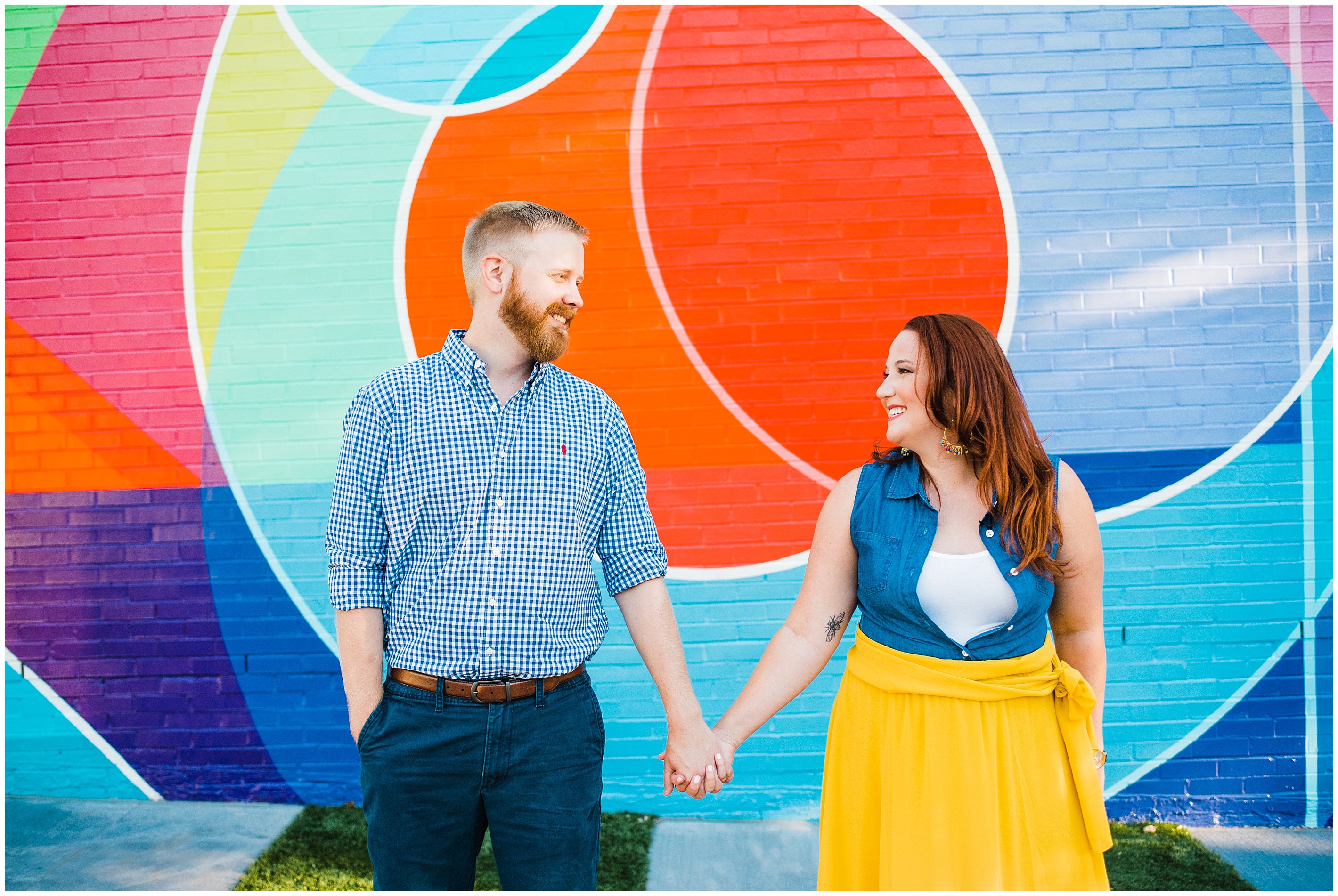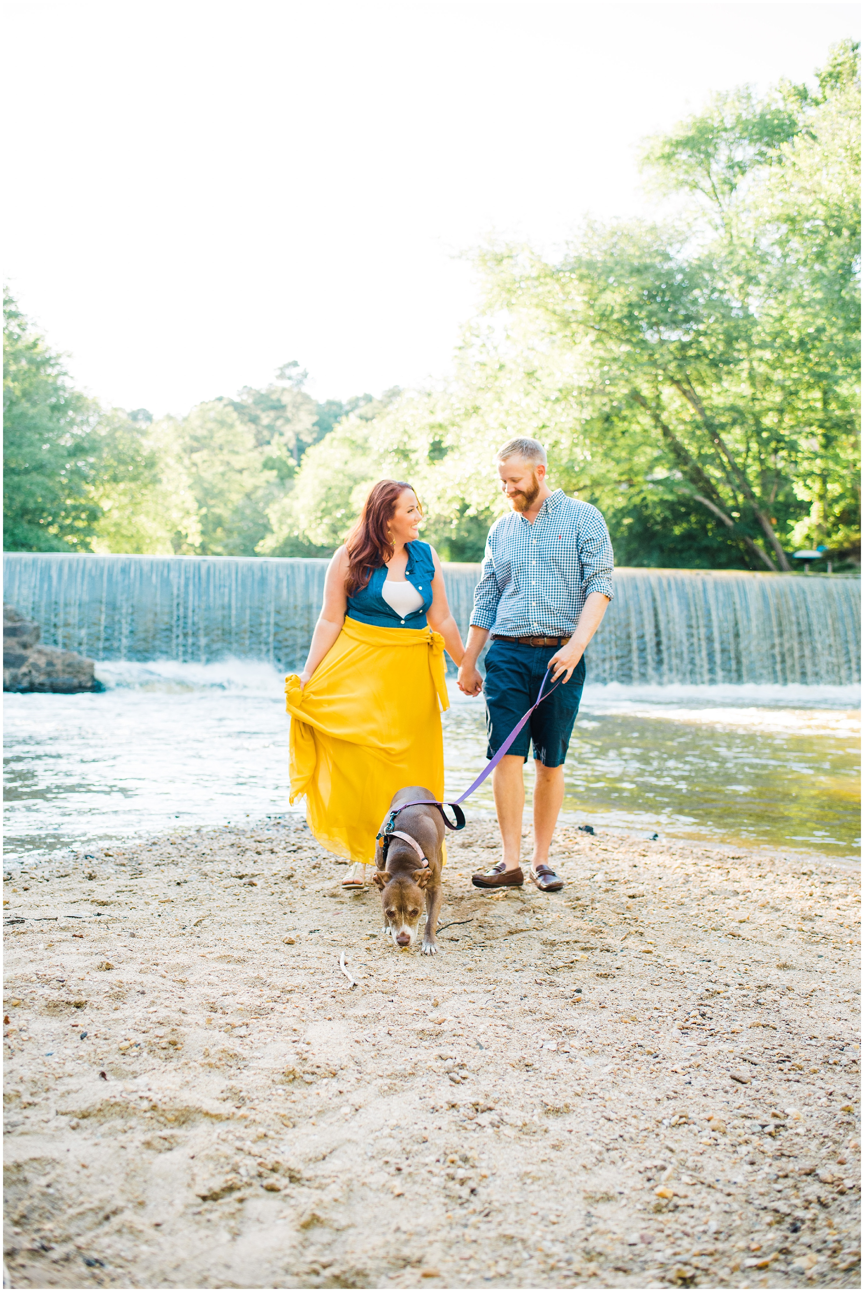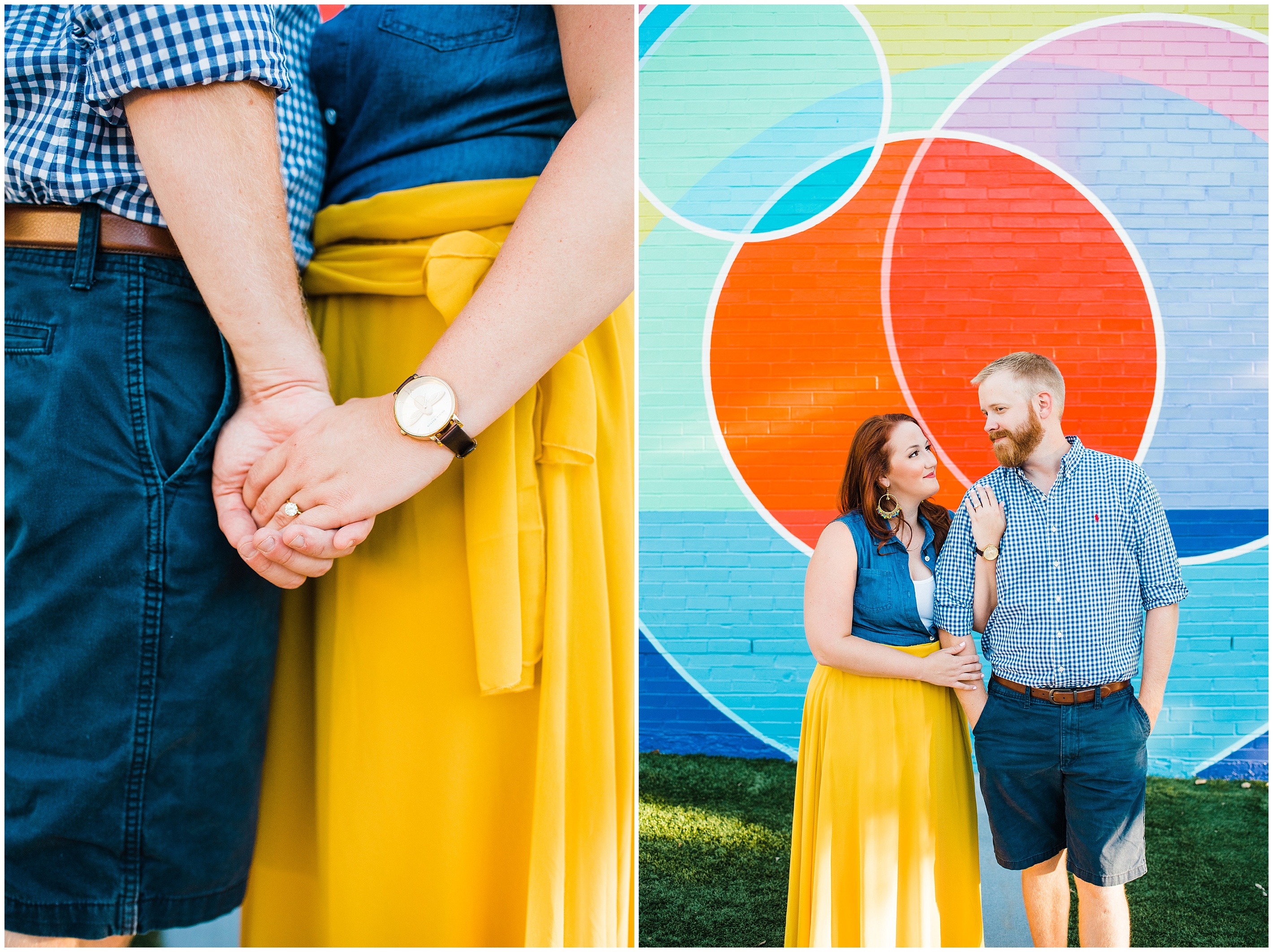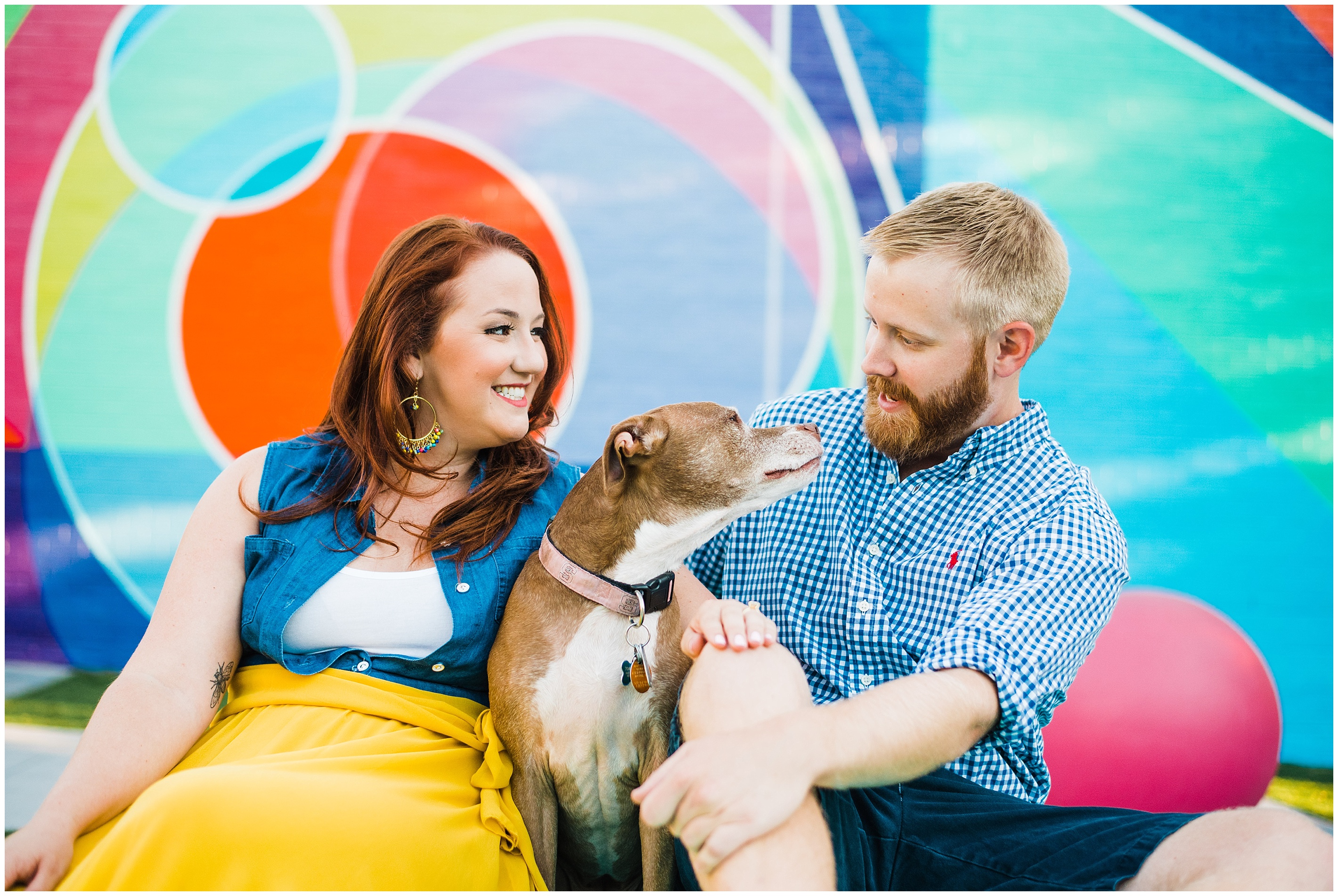 After a couple of snafu’s, we started their session at the spot Matt proposed, Lassiter Mill, with their adorable pup Folger in tow! Folger is, by the way, the most well behaved and chill dog I have ever seen! She was just hanging out with us. We shot a little bit down there, before hopping over to Downtown Raleigh, where we went to the Marbles Museum to shoot in front of their incredibly bright and colorful mural (two things that I love!) This was all Caroline’s idea, so I love how their outfit choices popped off even more with the bright wall.