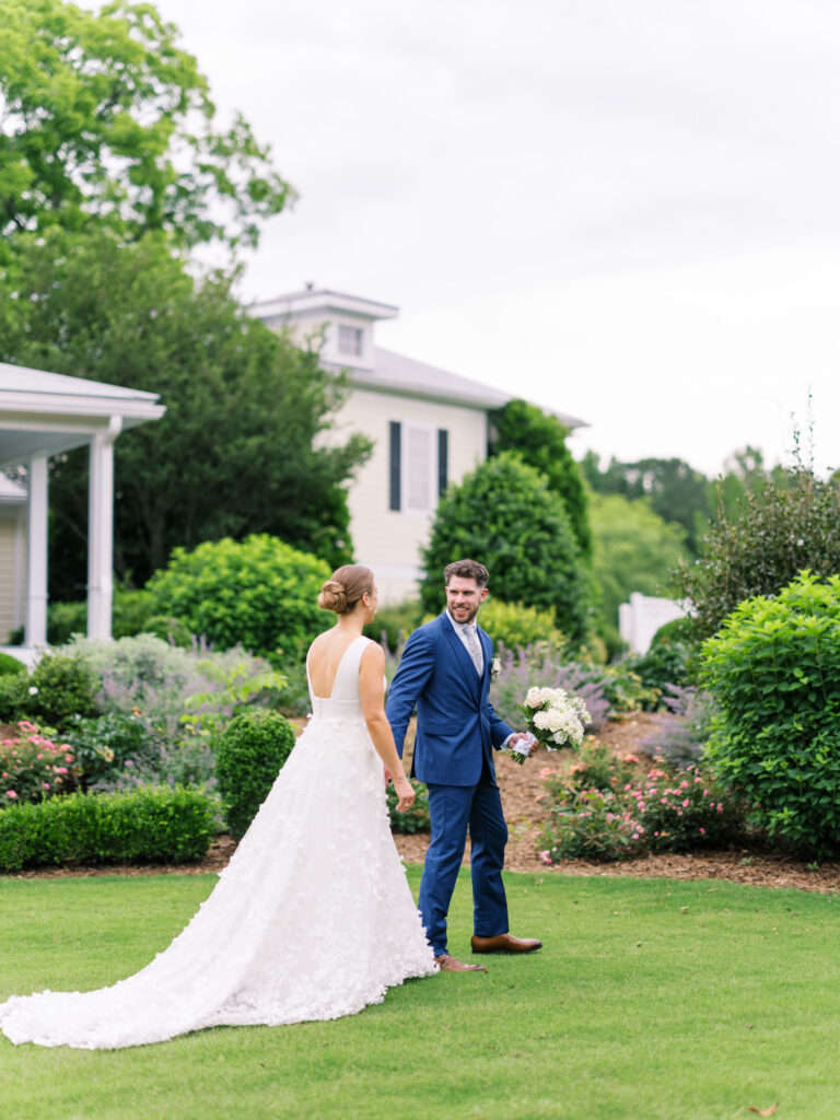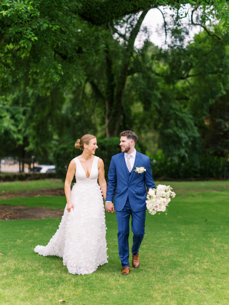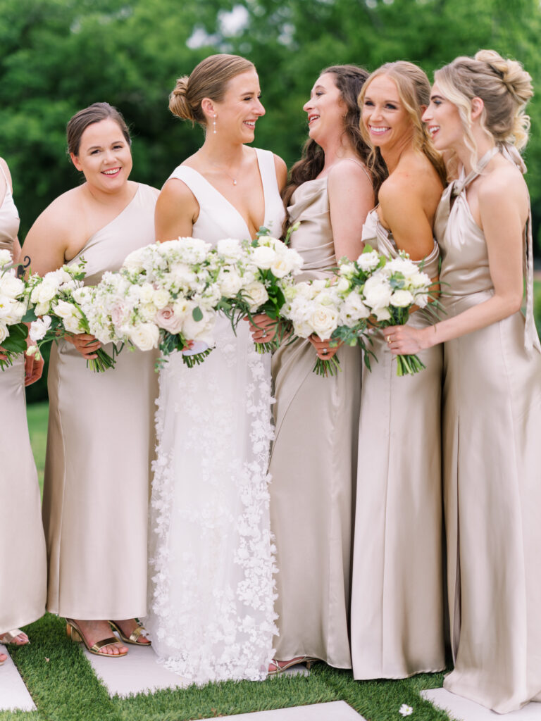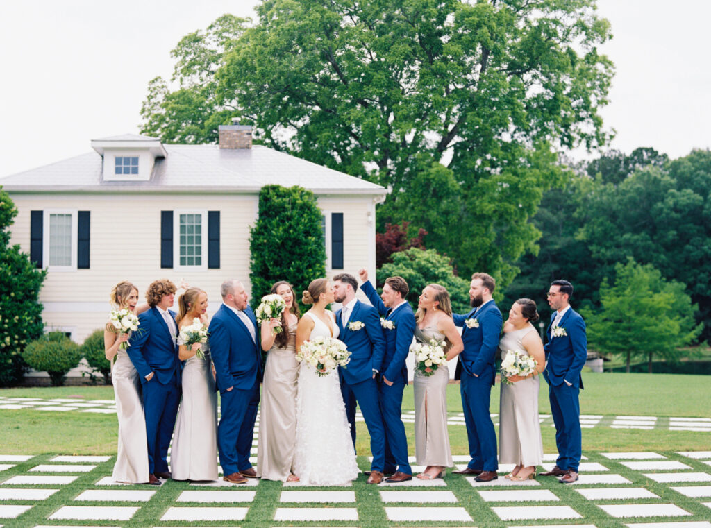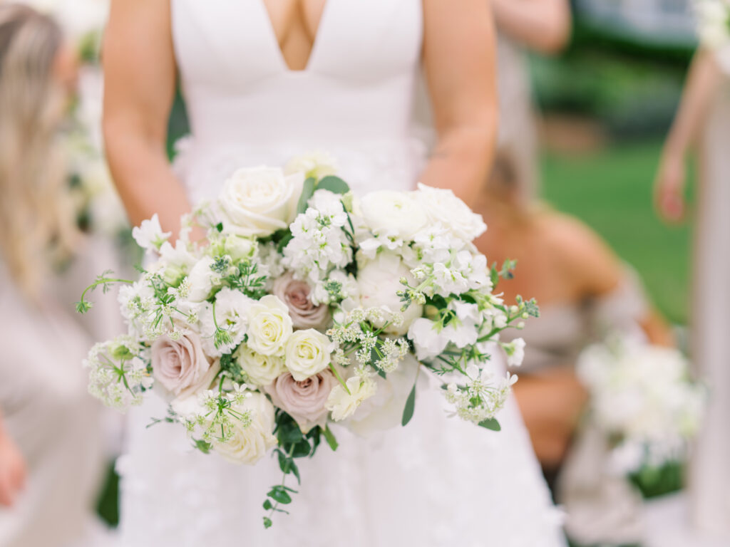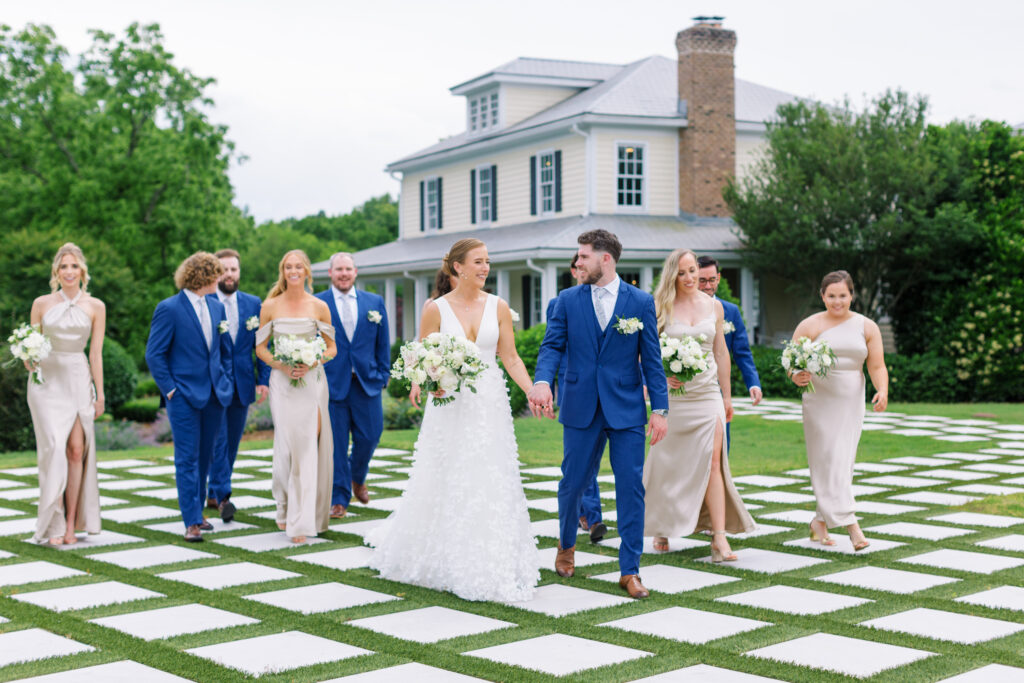 One West Coast girl and one New England boy met and fell in love in Durham, North Carolina. They brought their loved ones together to their new home to celebrate their wedding day—a neutral color palette for white florals and beige bridesmaids, with the Groom and groomsmen in navy. Whimsical florals from Once Gathered truly brought this floral-filled wedding day to life.