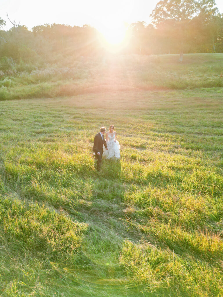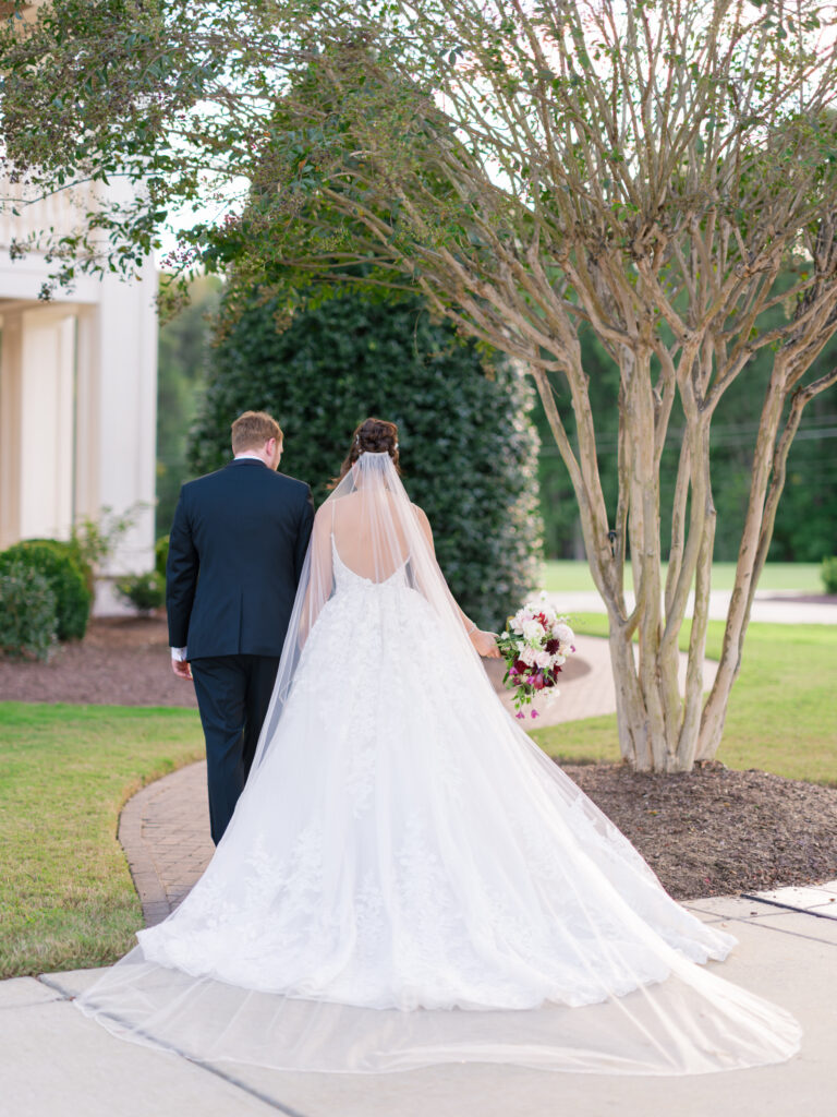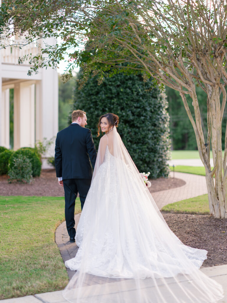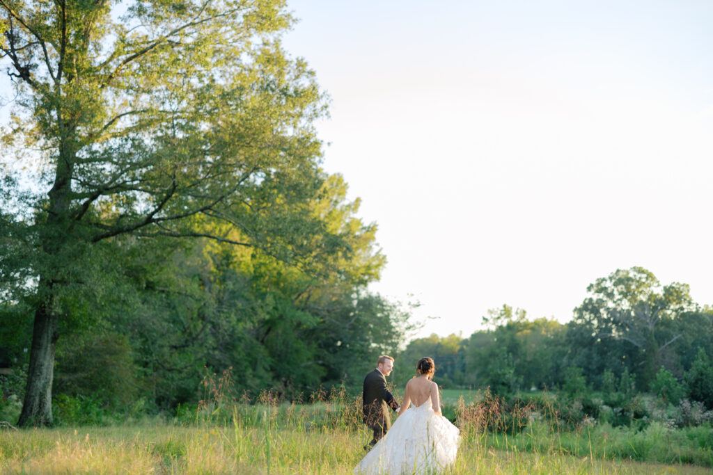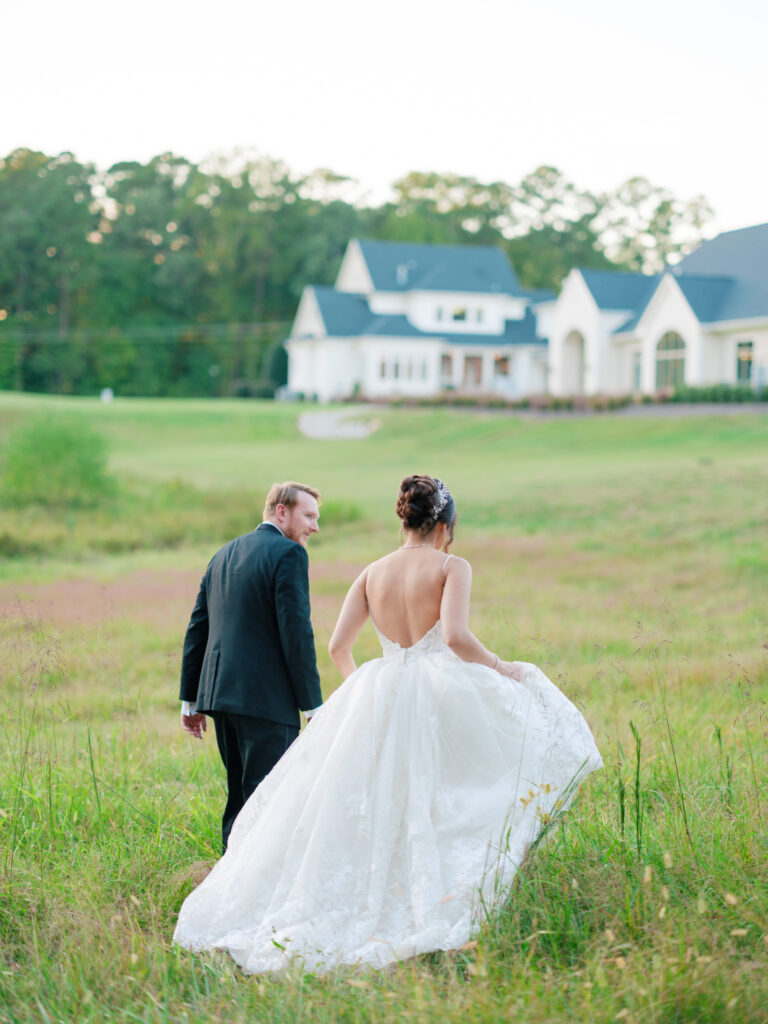 film golden hour photo of couple walking back to their reception at Donovan's Manor in Raleigh, NC