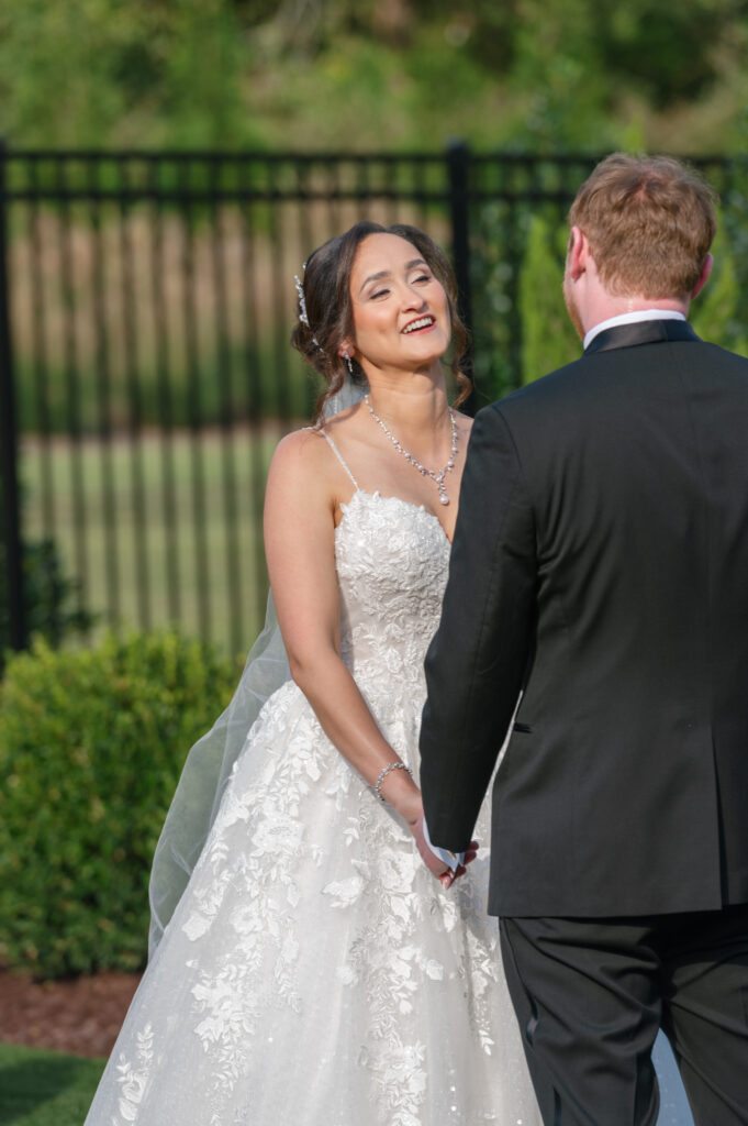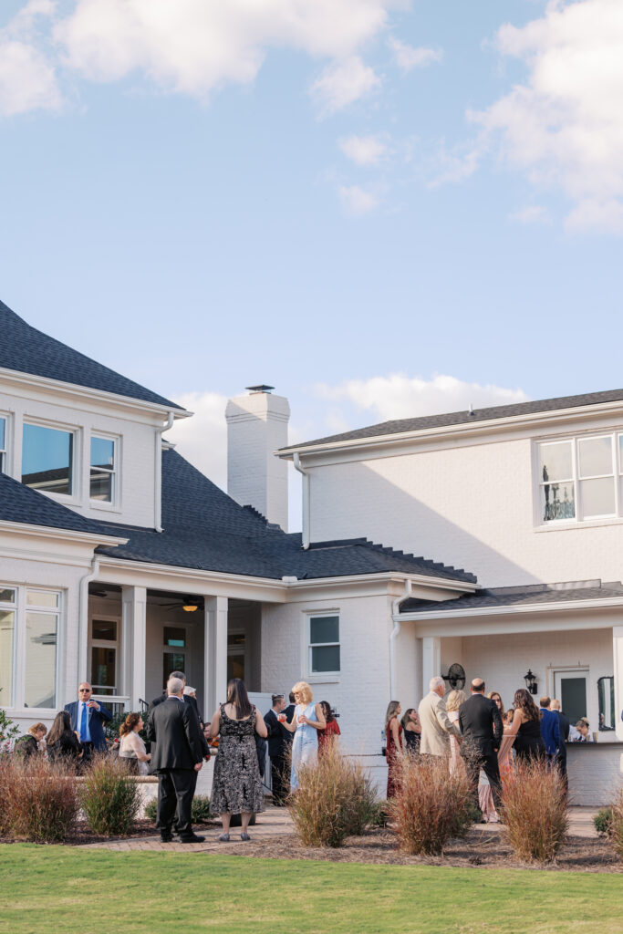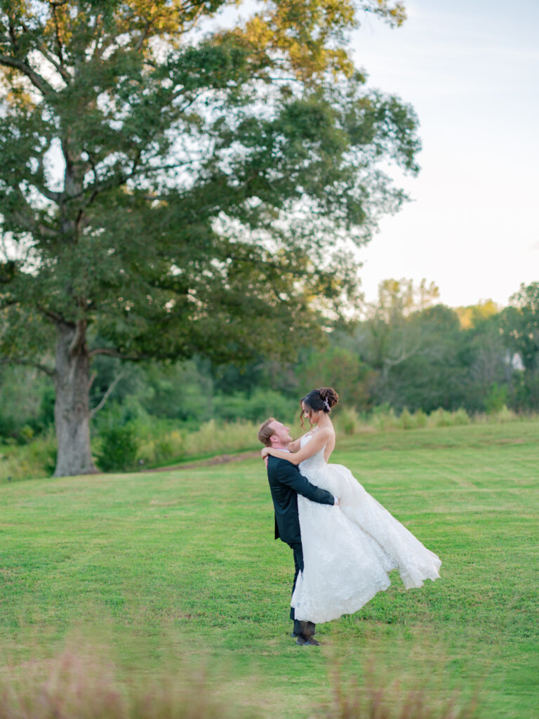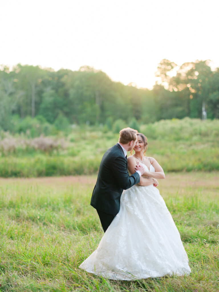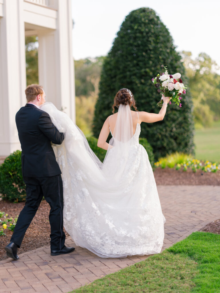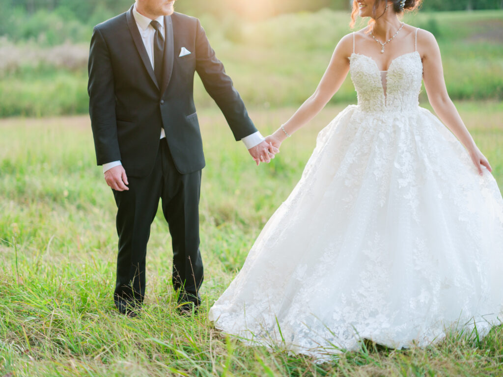 film golden hour photo of couple walking back to their reception at Donovan's Manor in Raleigh, NC
